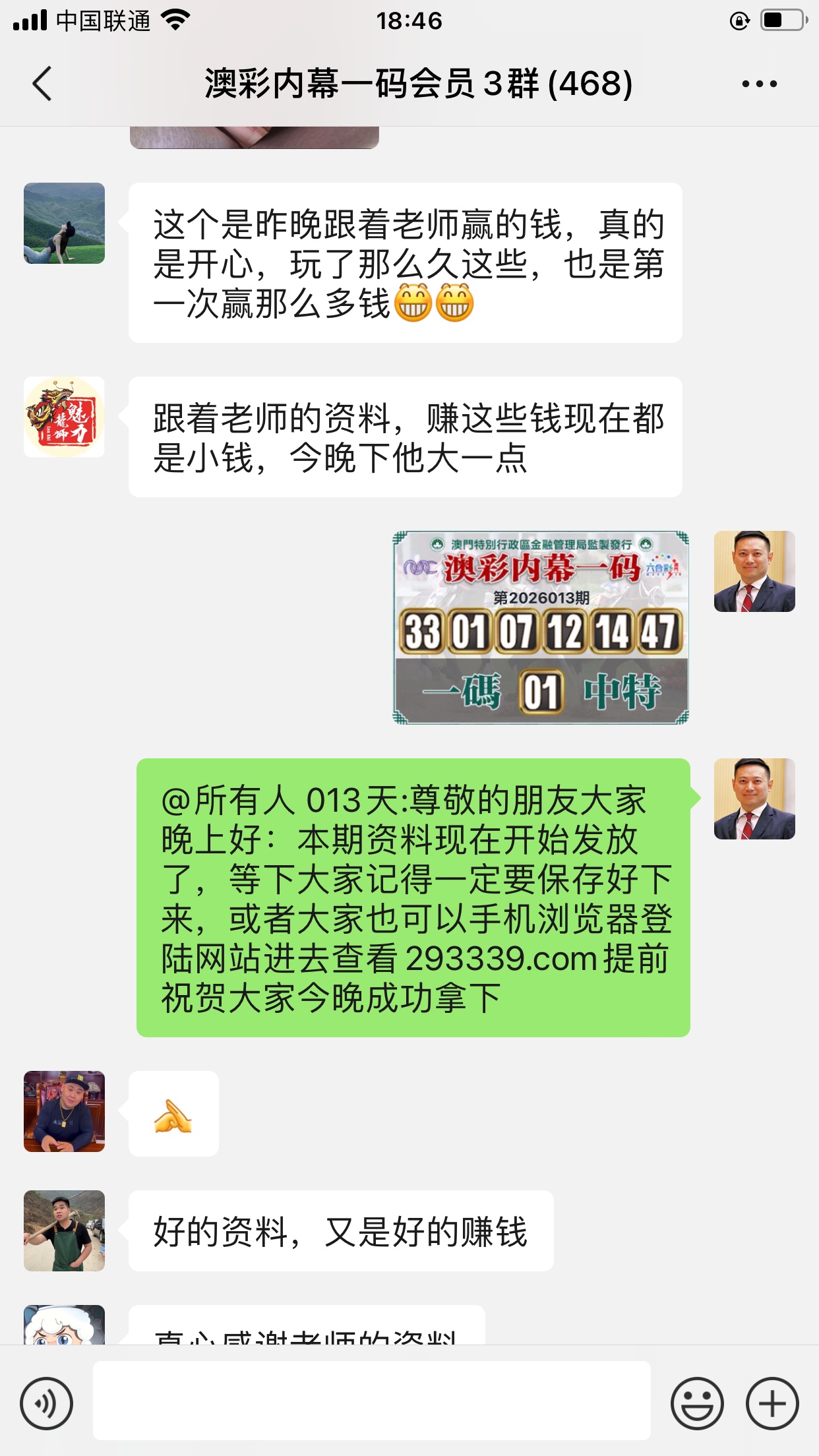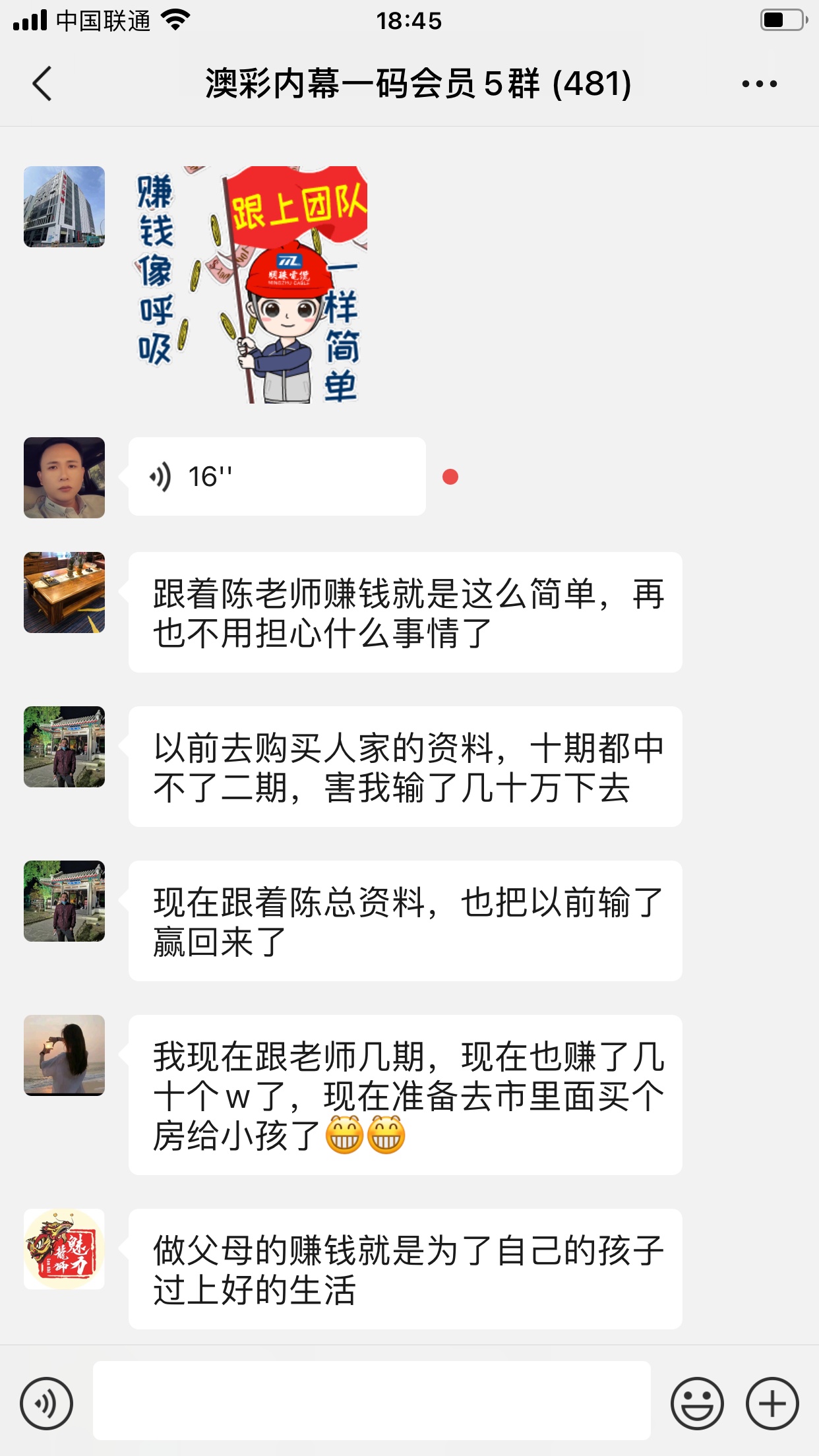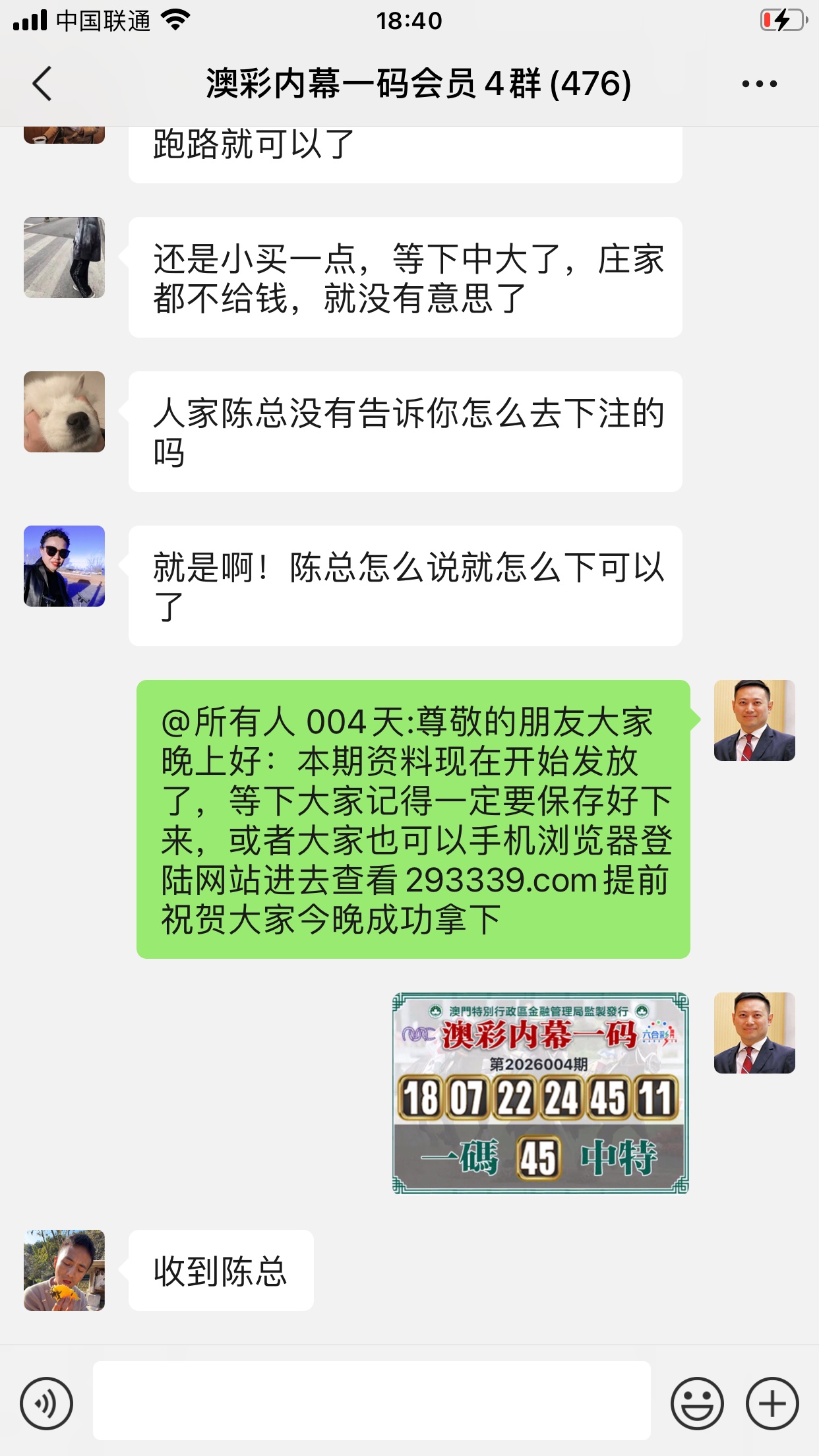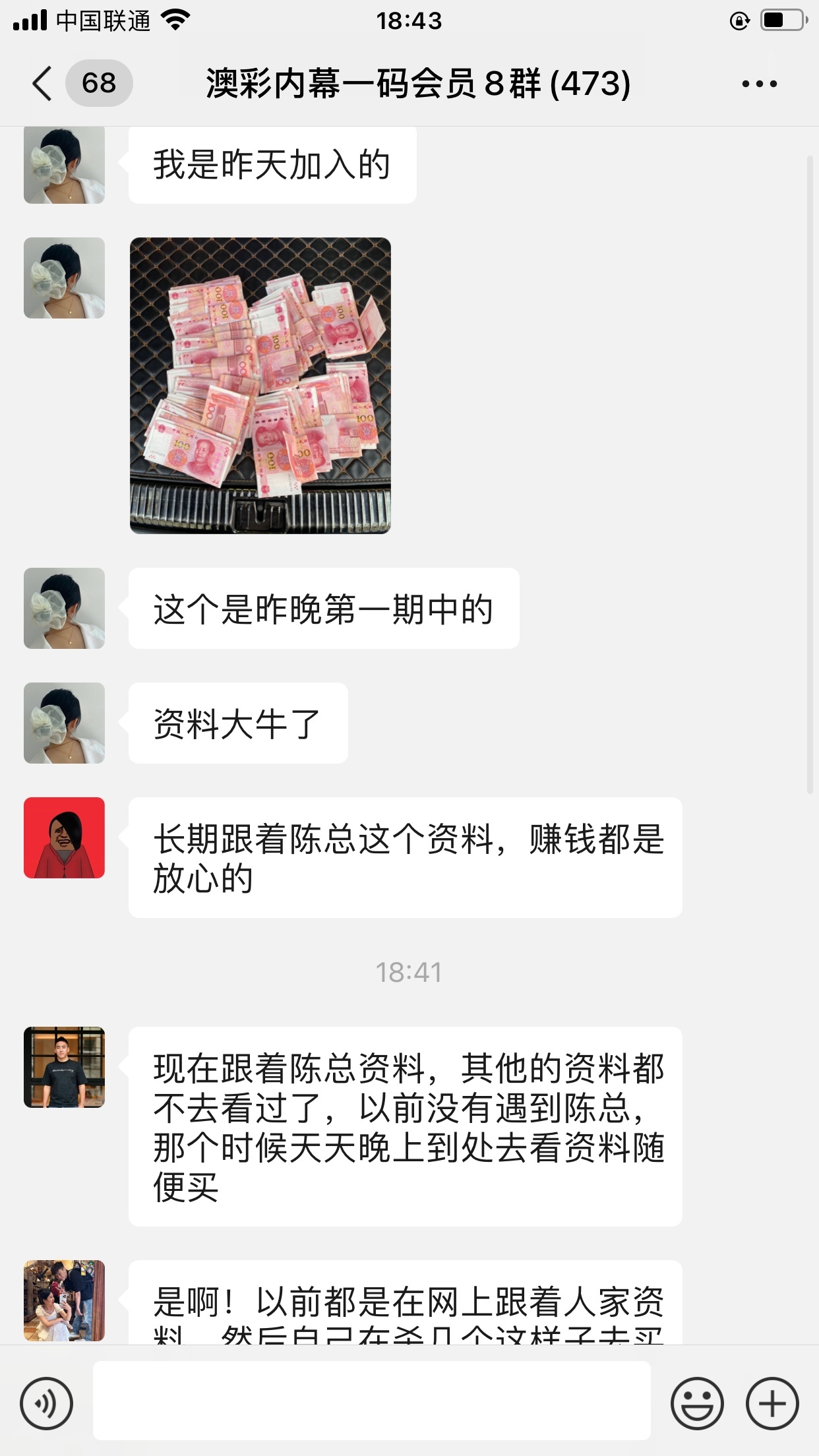 陈总你的资料太准了,昨晚中的钱刚从庄家那里拿回来,没找你之前输了十几万了,昨晚总算中回来一点了,以后就跟着你赚钱了。红包少不了你的,等我还清债务就发大红包感谢陈总!