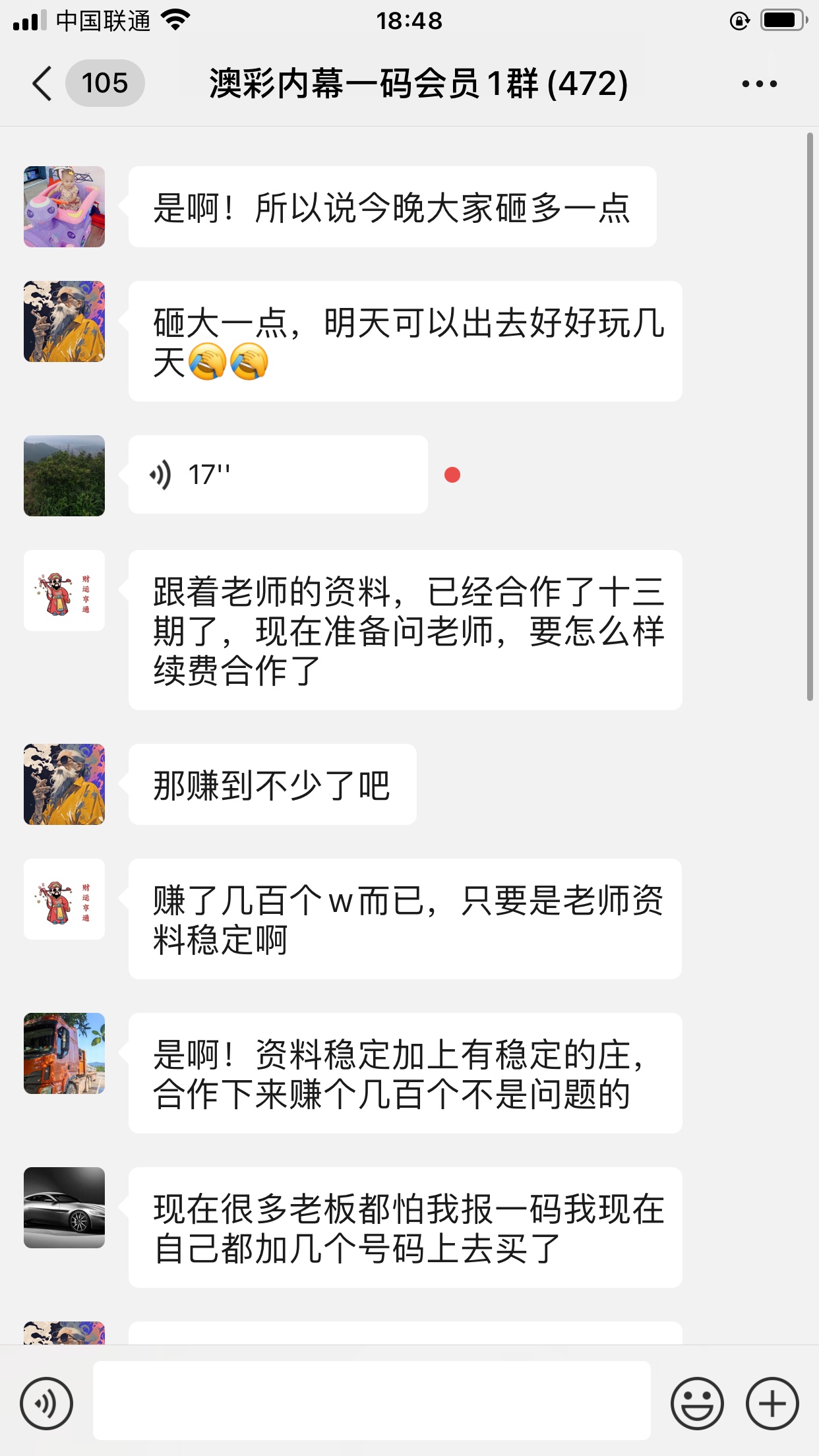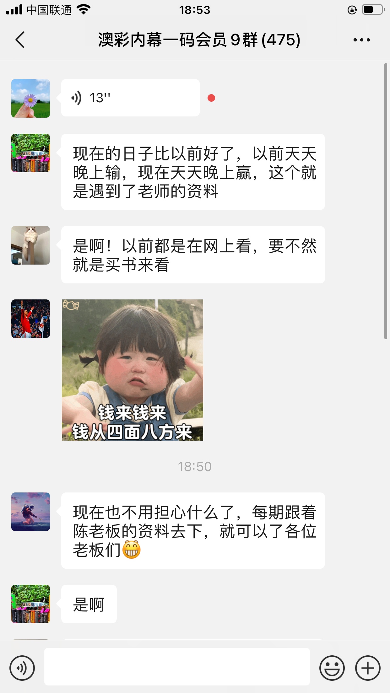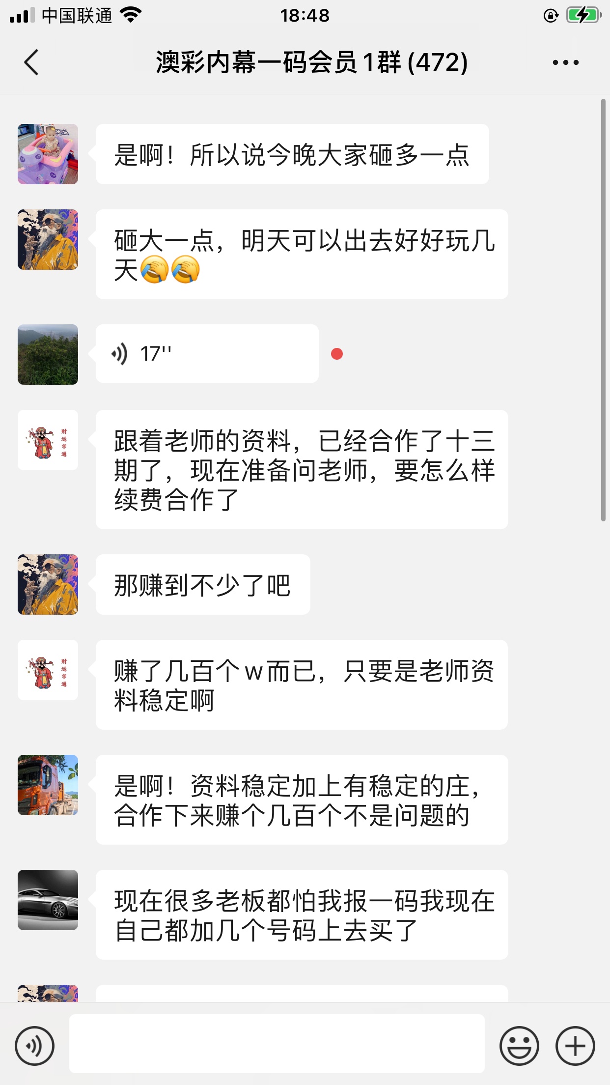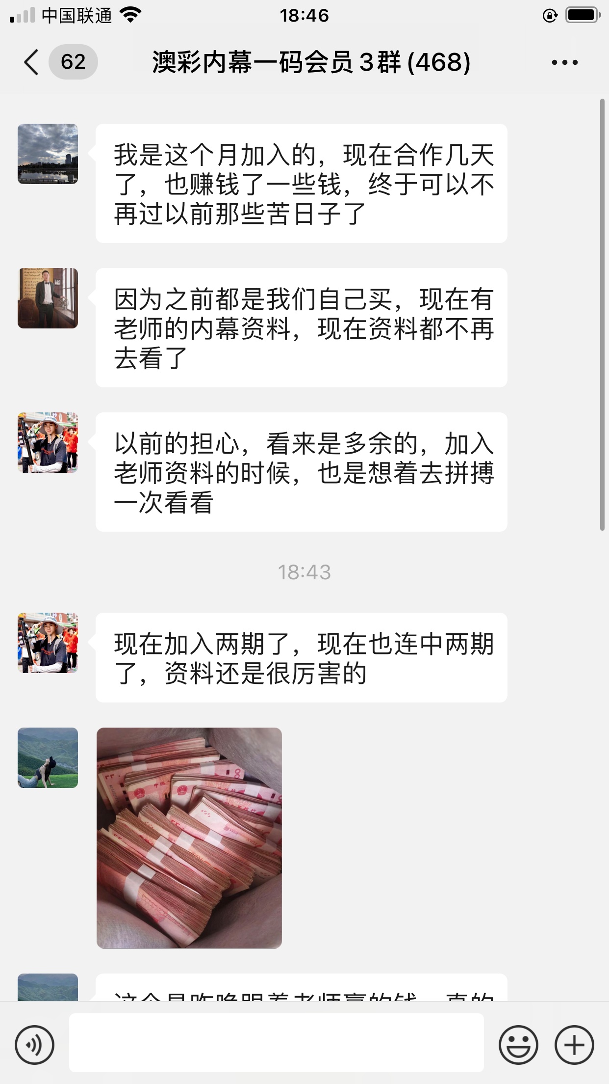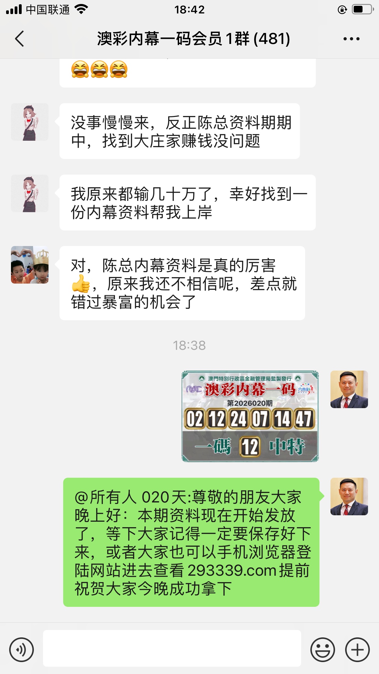 陈总你的资料太准了,昨晚中的钱刚从庄家那里拿回来,没找你之前输了十几万了,昨晚总算中回来一点了,以后就跟着你赚钱了。红包少不了你的,等我还清债务就发大红包感谢陈总!